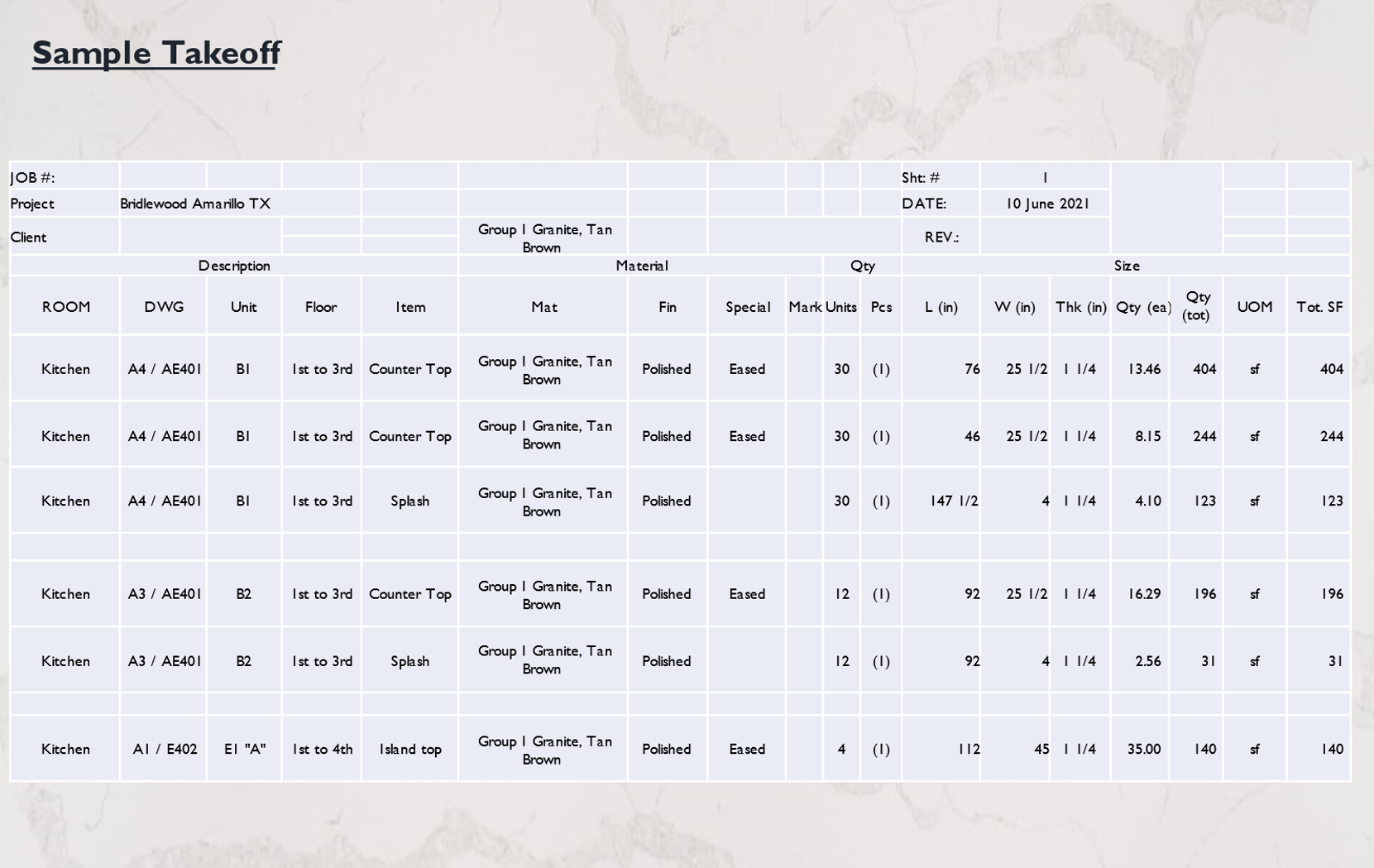 Detailed measurement of quantities as per stone/tile types, finish and respective labor items breakdown in units or areas. Items include countertops, vanities, floors, walls, facades, etc